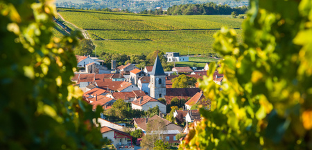 Vineyard rows stretch towards a village nestled amidst rolling hills and autumn foliage