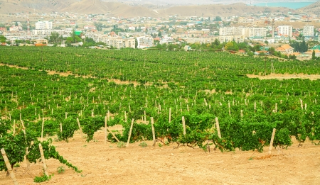 Rows of green vineyards. Grape vines field in summer. Krasnodar reggion, Russia.