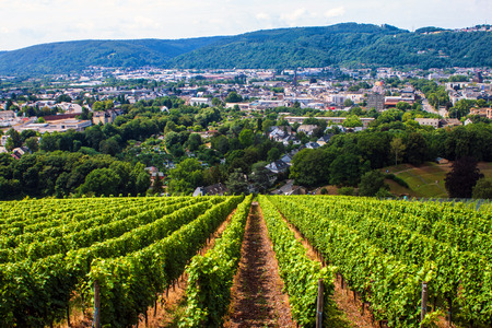 Scenic mountain landscape with vines growing on terraces near a picturesque village in Germany, Black forest. Colorful summer travel and vine-making background.