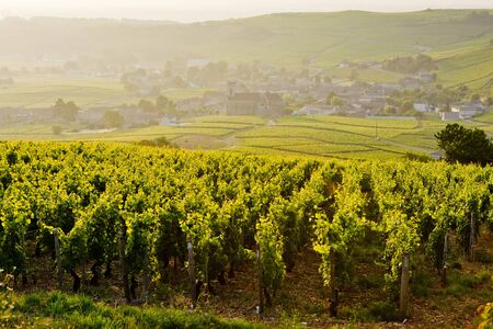 landscape vineyard rows of grapes in morning light clear sky and hills in the background