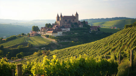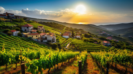 Lush vineyard rows at sunset, overlooking a charming town nestled amidst rolling hills