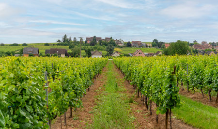 Rural landscape of Alsace in France. The small medieval town of Rosheim and its vineyard-covered hills.