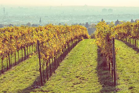 Vineyard in autumn colors, Vienna in the distance. Austria