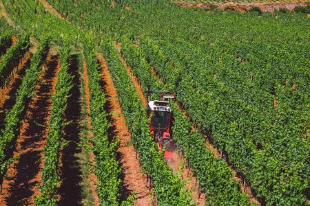 The theme of agrarian and winemaking in Europe. A red tractor processes a grape field on a sunny day on a mountainside. Organic wine production, modern farming in western Europe.