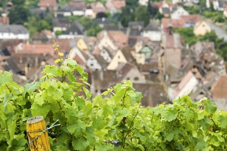 Grapevines in a vineyard and half timbered houses in the background in a popular village on the Alsatian Wine Route in Riquewihr, France