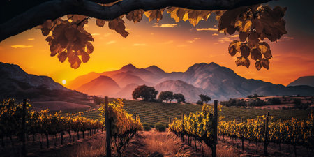 A beautiful view of a vineyard field at sunset, AI