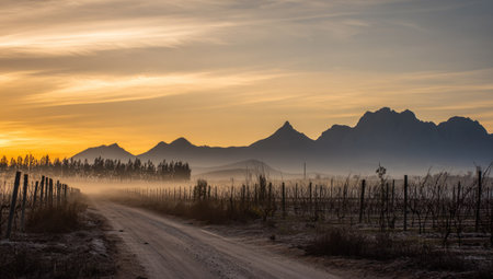 Landscape in Stellenbosch, Western Cape, South Africa, at sunset.