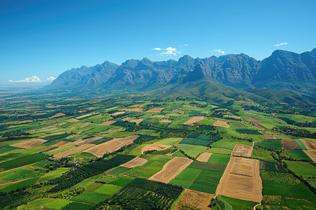 Aerial view of farm fields with green and brown crops in South Africa, clear blue sky, wide-angle shot, high-resolution photography. --chaos 30 --ar 3:2 --quality 2 --stylize 500 --v 6.1 Job ID: 0dc4a888-7c29-4969-865a-6eed5a225281