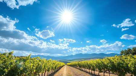 Serene vineyard road amidst grapevines leading to distant hills