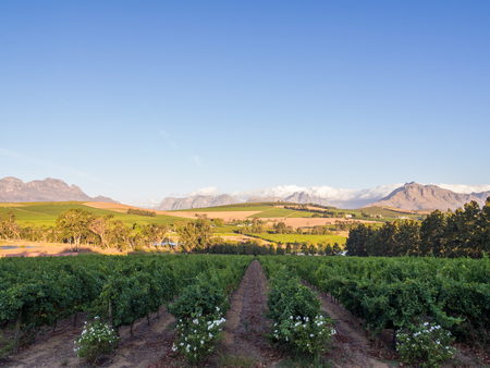 Wine farm. Vineyard landscape at sunset with mountains. Stellenbosch, South Africa. vine grapes rows.