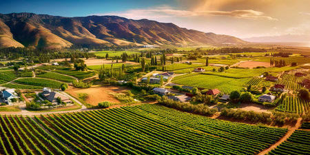 Wine vineyards over the farmlands valley next to high mountain terrain a scenic landscape.