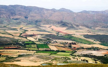 Landscape of farmland and village at the foot of barren hill as seen along the the Route 62 road near Barrydale in Western Cape, South Africa.