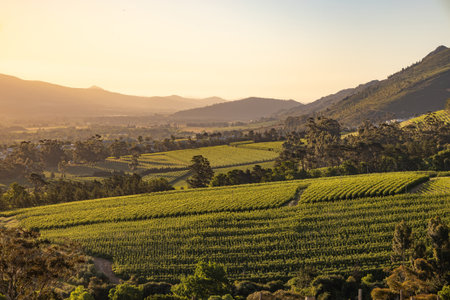 Wine region Stellenbosch, South Africa. vine grapes rows, vineyard landscape at sunset