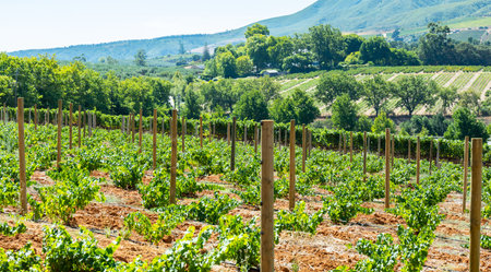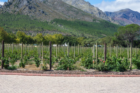 Neat and tidy rows of young grapevines in the warm South African sun near Franschhoek