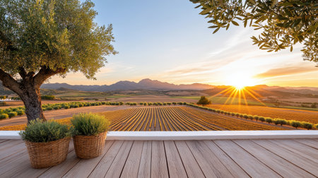 A scenic sunrise view over Spanish olive farm with mountains
