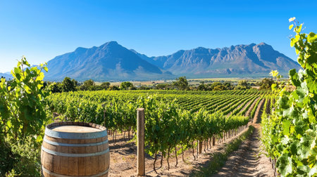 A stunning view of a lush vineyard landscape featuring rows of grapevines, a rustic barrel, and majestic mountains under a clear blue sky.