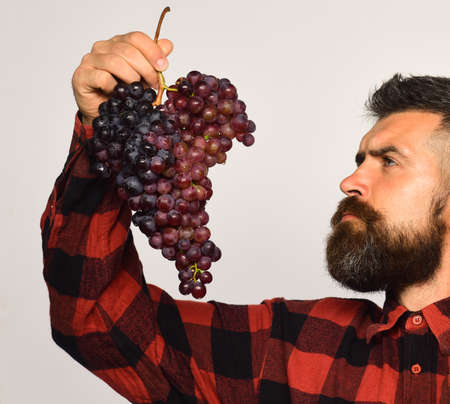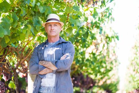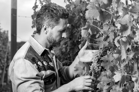 male vineyard owner. professional winegrower on grape farm. man harvester on summer harvest