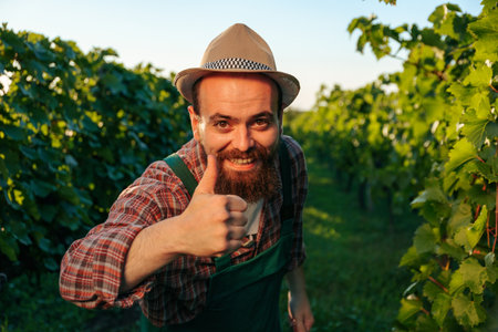 Front view looking at camera young winemaker farmer male vineyard worker laugh thump up with one hand happily and playfully. Blurred background of a green vineyard stretching into a clear blue sky.