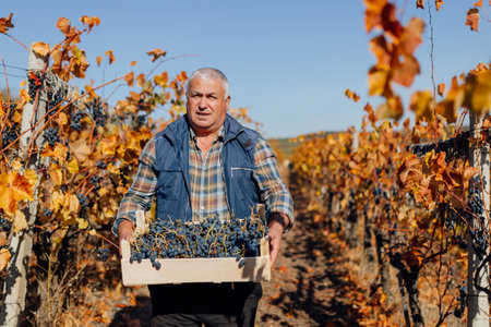 Amid harvest bounty viticulturist with grape crates culmination of diligent year's labor