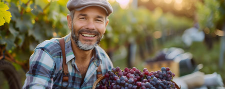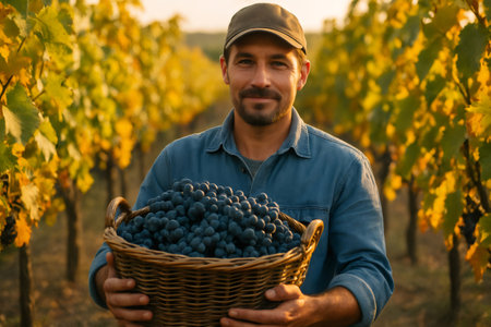 Winemaker proudly holding a basket full of ripe grapes in a vineyard, bathed in the warm glow of the setting sun