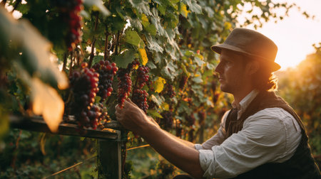 A winemaker examines ripe grapes in a vineyard at golden hour, surrounded by lush vines and soft warm light, preparing for wine production.