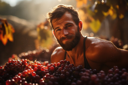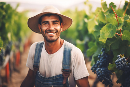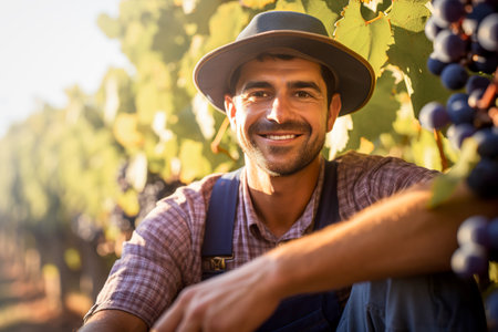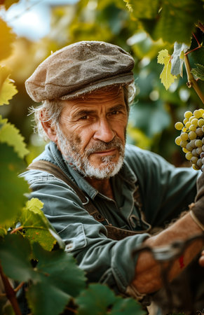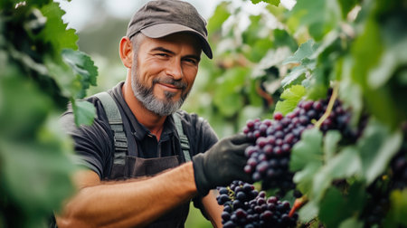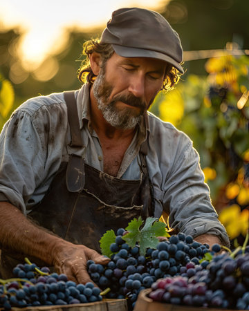 Rustic scene featuring a male farmer harvesting ripe grapes in a vineyard, showcasing the essence of traditional winemaking.