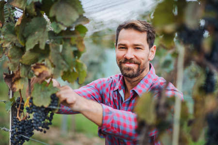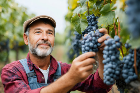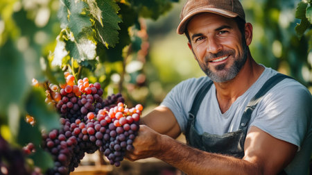Confident farmer examining ripe red wine grapes in a vineyard during harvest season