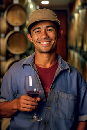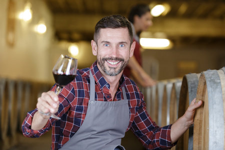 Confident winery owner Confident young man in apron holding glass with red wine while standing in wine cellar : Generative AI