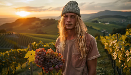 A Nordic blond man with long hair wearing a loose-fitting t-shirt. and beanies Among the undulating vineyards as the sun sets holding a bunch of ripe grapes.