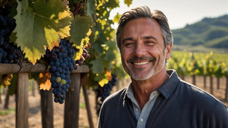 A man stands in a vineyard surrounded by ripe grapes, smiling broadly under the warm sun. The verdant hills in the distance highlight a perfect autumn day dedicated to the grape harvest.