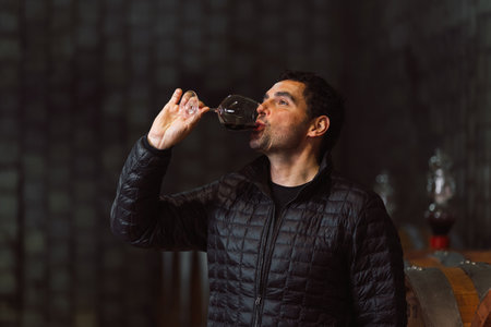 A man in a black jacket tastes red wine inside a rustic winery surrounded by wooden barrels and dim lighting.