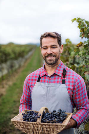 Man worker holding basket with grapes in vineyard in autumn, harvest concept.