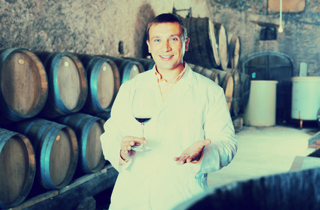 joyful factory sommelier in white robe checking quality of red wine in cellar with barrels