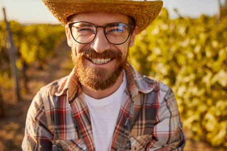 Cheerful bearded male farmer in glasses and hat smiling and inspecting a bunch of fresh grapes during harvest on the vineyard. An adult male winemaker holds a basket full of red grapes.