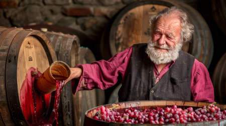 Smiling Winemaker Pouring Red Wine from Oak Barrel into Bucket with Fresh Grapes at Winery