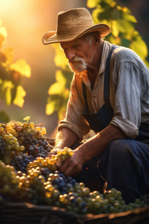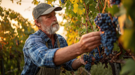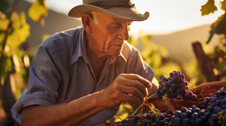 Mature farmer picking ripe grapes in organic vineyard at sunset generated by artificial intelligence