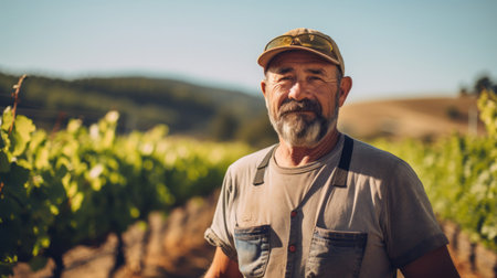Weathered Vintner Inspects His Wine Grape Harvest in the Vineyard. Generative AI.