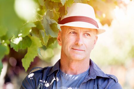 Successful winemaker at their vineyard. Handsome senior man in straw hat and shirt posing in garden. Traditional family winemaker business. Confident vintner with arms folded standing at vine row.