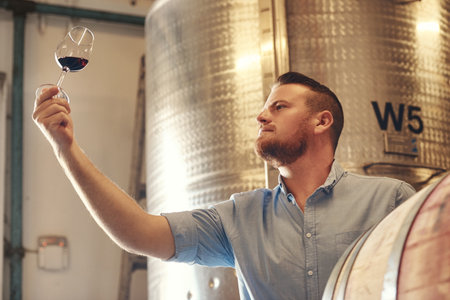 Portrait of a handsome wine maker in working apron with the wine glass at the manufacture with metal tanks for wine fermentation. Wine production at the modern factory