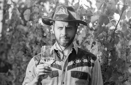 enologist with wineglass. sommelier. farmer drink wine. cheers. vinedresser drinking.