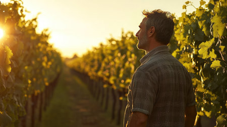 A man stands in a vineyard at sunset, enjoying the beauty around him. The warm light filters through the grapevines, creating a tranquil atmosphere.