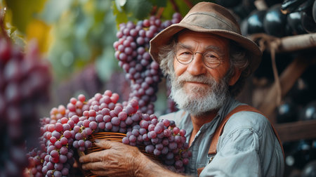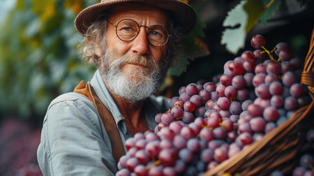 A well-dressed senior winemaker holding a basket of freshly harvested grapes, smiling in a vineyard at golden hour.