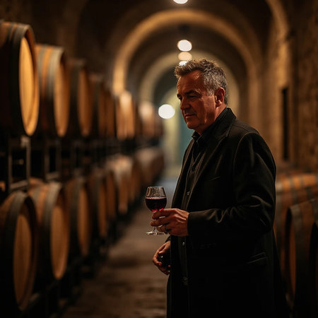 A winemaker stands in a cellar bathed in warm golden light, reflecting on his craft surrounded by wooden barrels.