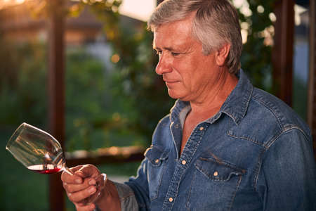 Calm attentive Caucasian man in a denim shirt standing outdoors with a glass of red wine and tilting it