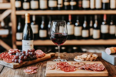 Vintage wine bottles are displayed in a stylish cellar. A tasting table holds a glass of red wine accompanied by a charcuterie board.