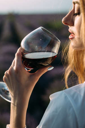 beautiful woman with a glass of red wine. curly hairstyle. Outdoor activities, wine tasting