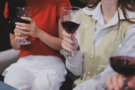 Women having girls night out, close up of two glasses filled with red wine or alcohol drink.