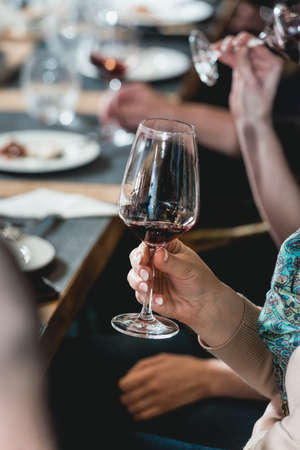 Glass of red wine seen close up in the hand at a wine tasting with friends