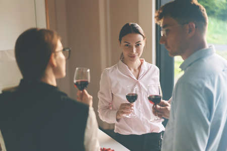 We celebrate success with a glass of red rose and white wine in hand at a special tasting with happy people.