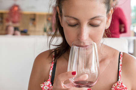 Closeup portrait of young woman with ponytail drinking red wine. Leisure, drinks, degustation, people and holidays concept. Defocused blurry background.